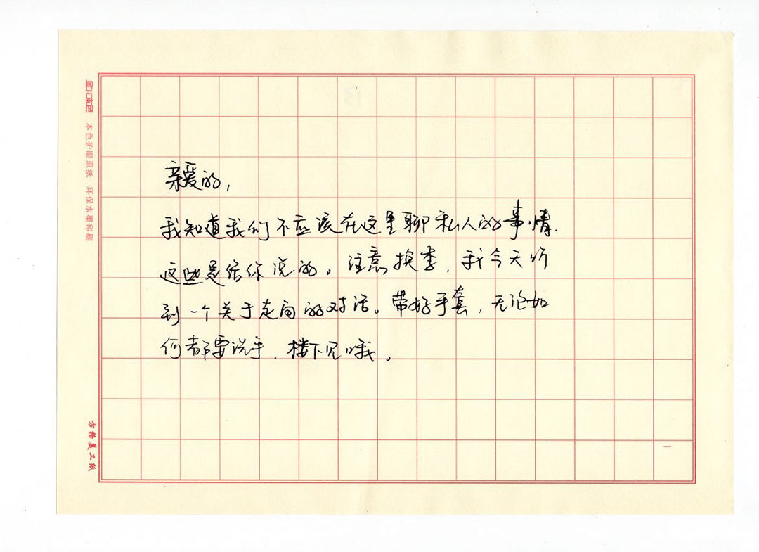 Some videos and there construction of the "Green Diamond" slogans have been reconstructed in collaboration with the workers of Bernard Control Factory, a company located in Jinghai Road, not far from the original headquarters of Green Diamond Factory. The recreation of the "Green Diamond gestures" have been possible through the efforts of Wu Shuqing, a current emplyee of Bernard Control Factory.
